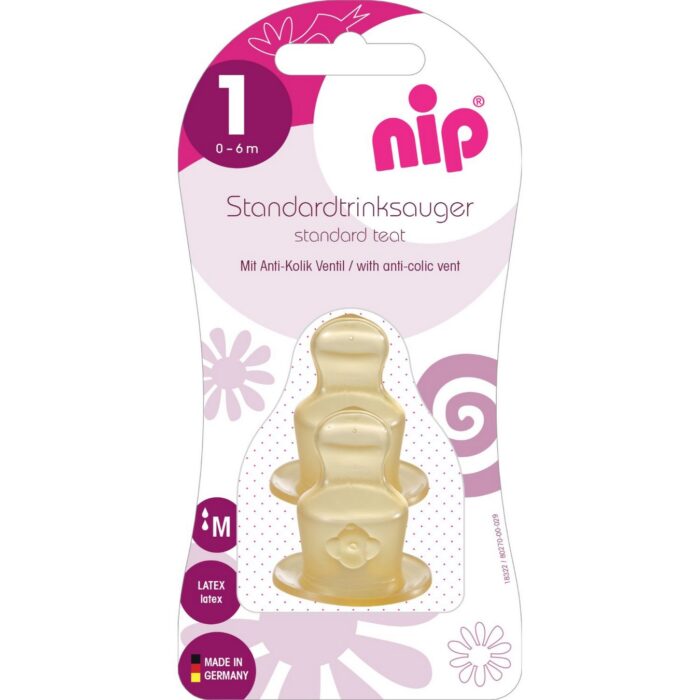 Nip cucla je od kaučuka sa srednjim protokom za uzrast 0-6 meseci. Poseban sistem protiv grčeva. Kompatibilna sa svim standardnim flašicama.