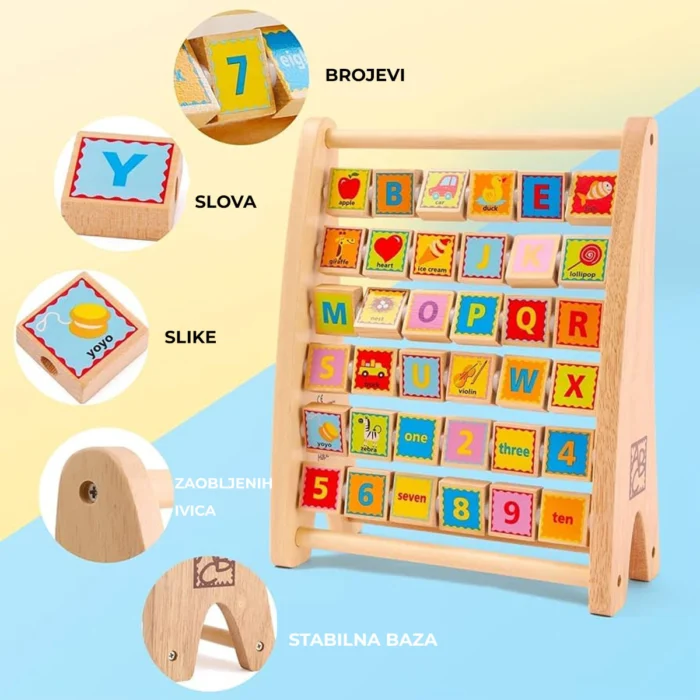 Abakus je idealna igračka za decu koja razvijaju koordinaciju ruku i očiju. Šarena slova privlače pažnju deteta. Odlična kombinacija zabave i učenja. Dete uči slova, brojeve, vežba koncentraciju, što pomaže detetu da razvije potrebne veštine. Dodatna atrakcija za decu je mogućnost okretanja slova. Igračka namenjena deci starijoj od 24 meseca.