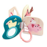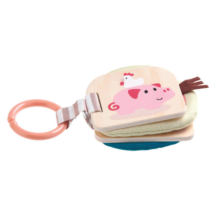 Zahvaljujući plastičnom prstenu, knjižica se lako može zakačiti za kolica, krevetac ili druge površine dostupne za igranje.