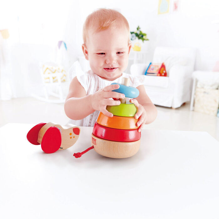Hape dindolino šareno štene koje se može slagati pomaže deci da identifikuju različite oblike i boje, kao i da laje kada mu se udari glavom.
