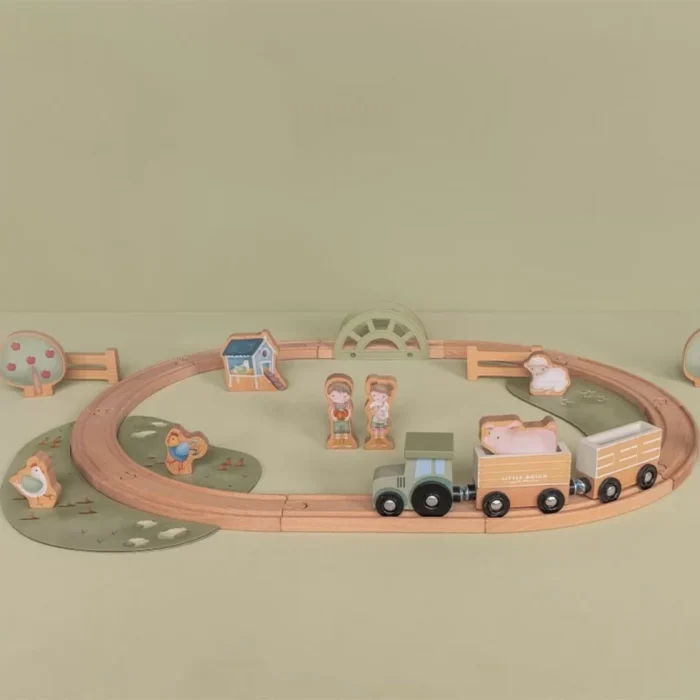 drvećem, životinjama i stanovnicima farme, uključujući Rozu i Džimija. Drveni vozić podstiče razvoj koordinacije ruku i očiju kod
